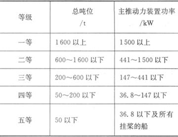 根据交通部1992年颁布的《内河船舶船员考试发证规则》规定,为了给参加不同级别船员考试的船员发给相应的船员适任证书,将内河船舶按船舶总吨位或主推动力装置功率划分为5个等级。原则上驾驶专业适任证书等级按船舶总吨位划分;轮机专业适任证书等级按主推动力装置功率划分。