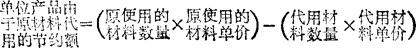 解决原材料短缺和降低原材料消耗途径之一。在保证产品质量的前提下,合理地进行材料代用,不仅可以扩大材料来源,促进生产发展,也是降低成本的重要途径。使用代用原材料所取得的节约额可按如下公式计算: