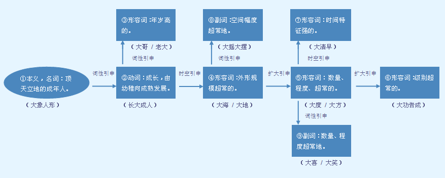 释义 | ![]() (体积、容量、面积、数量、力量、规模、程度等方面)超过一般或超过对方: 巨~|~风|~房子|~局为重|深宅~院|庞然~物|声势浩~。 小 xiǎo ~型|~百货|~题大作|~巧玲珑|~手冻得红通通的|他们最后只得到一个~项目。 ❶在体积、面积、深度、强度等方面超过一般或超过所比较的对象。可以重叠。可受程度副词的修饰。可带“了”“起来”,表示变大。 a.作定语。 他写了两个很~很~的字|这是省城的~医院|母亲最~的特点是一生不曾脱离过劳动|~~的眼睛|藤野先生挟着一叠~~小小的书。 b.作谓语,可带补语。 仙台是一个市镇,并不~|他人长高了,力气也~了|那箱子~得很|转眼间,雪就~起来了。 c.作补语。 小明把熊猫的眼睛画得~~的|气球变~了。 ❷放在某些时令、节日前,表示强调。作定语。 老张~清早就出去了|~热天的,你走这么快干什么?|~年初一的,你生什么气呀? ❸表示排行第一。作定语。 这是他的~女儿。 表示程度深。可重叠,重叠后强调意味更重。常用在单音节的动词或者形容词前面作状语。用在副词“不”前面,表示程度深;用在副词“不”后面,表示程度浅。在“大喊大叫”“大红大绿”“大手大脚”等习惯用法中,表示规模大,程度深。 雕刻家~哭了一场|天已~亮|小说~受赞赏|生产程序经过改进,~~节省了时间|质量~~提高了|心里~~地不舒服|~~地热闹了几天|祖母精神~不如前|制台一听,心中~不高兴|北方人不~喜欢吃红薯|这事我不~清楚|~红~绿|~操~办|~书而特书|~讲而特讲。 【反】 〈形〉❶❸小 【词语】 大本营 大吹大擂 大刀阔斧 大法 大风大浪 大夫 大纲 大公无私 大计 大惊小怪 大快人心 大名 大模大样 大篷车 大厦 大赦 大声疾呼 大失所望 大是大非 大庭广众 大团结 大同小异 大无畏 大喜过望 大言不惭 大有作为 【注意】 又读dài,如:大夫(dài·fu,指医生)、大王(dài·wɑng,戏曲、旧小说对国王或强盗首领的称呼)。 字源解说 大,甲骨文 ![]() ![]() ![]() ![]() ![]() ![]() ![]() ![]() ![]() 附 文言版《説文解字》:大,天大,地大,人亦大。故大象人形。古文才也。凡大之屬皆从大。 附 白话版《说文解字》:大,天大,地大,人也大。所以“大”字像人的形象。大,这也是古文写法的“才”字。所有与大相关的字,都采用“大”作边旁。 引申线索 ![]() 【字族索引】 大 【同音字】 dà dài |