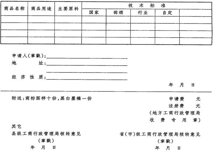 【简介】: 商标注册申请书是商标注册申请人向商标局申请商标注册的主要文书,其中“商标名称”指组成商标的文字读音或商标图形的称谓;“商品名称”指该申请注册商标适用的商品,具有确定商标专用权范围的作用;“商品用途”指申请注册商标商品的功能;“主要原料”栏填写生产该商品所需的主要原料;“技术标准”指该商品的产品设计、投料、配方、制造加工、包装、检验等生产流程所依据的标准等级,根据实际情况分别在国家、部颁、行业、自定栏内划“√”,如使用国际标准,可另注明。此外,申请人姓名、住址、经济性质应与营业执照一致。 【范例】: 商标注册申请书 国家工商行政管理局商标局: 现拟以________商标,使用于商品分类第一类(国际分类第____________类)的下列商品申请注册。