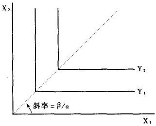 则称它为固定比例(或里昂惕夫)生产函数。例如把y看成生产出成套衣服的数量,x1看成生产过程中投入的劳动时间(小时),x2看成投入的衣料长度(公尺),如果制造一套衣服要α小时的劳动和β公尺的衣料,则当投入x1小时的劳动和x2公尺的衣料所能制造的最大衣服数就是min(x1,x2),即固定比例生产函数。这种函数的图形为: