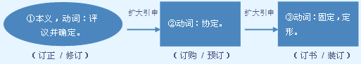 释义 | ![]() ❶动 预先约定。 【例句】~杂志。 【同义】订阅 【辨析】“订”多用于口语;“订阅”多用于书面语,一般不能带单音词作宾语。 ❷动 装订。 【例句】她用纸~成一个本子。 【同义】装订 【辨析】“订”多用于口语;“装订”多用于书面语。 ❶经过研究商讨而立下(条约、契约、计划、章程)。可重叠。可用在“把”字句里。 a.常作带宾、带补谓语。 ~了友好条约|~~计划|~具体措施|双方没谈好,合同还~不了|计划~得很周全|把方案~好|暂时还~不了启程日期|要预先~出指标来|每个班都~起卫生公约来了|居民公约已经~了。 b.作定语,要带“的”。 ~了的规章就必须坚决执行|~了的合同谁也不能撕毁。 ❷预先约定。可重叠。常作带宾、带补谓语。 请你给王总工程师~~车票|杂志~家里|这种期刊我只~过一次|约会~在公园长廊|电影票~好了|又~上《中学语文教学》杂志了|已~好30张川剧票|这批水果鸿化总厂已~了。 ❸改正(文字中的错误)。常用作语素构成合成词。 ~正|修~|校~|增~|考~|改~。 ❹装订。常作带宾、带补谓语。 我用废纸~了一个本子|~讲稿|本子~好了|这些讲义应该~在一起|把这几张卷子也~上去|一个本子~了十分钟|每人都~好了一摞本子|别马马虎虎地~|用机器~|这批书要仔细点儿~。 【辨】 订和定:在动词“预先约定”的意义上“订”和“定”也不完全相同,“订”着重于商讨的过程,“定”着重于确定的结果。 【词语】 订购 订户 订婚 订货 订交 订阅 订正 字源解说 丁,既是声旁也是形旁,是“钉”的本字,表示使固定,使确定。订,篆文 ![]() ![]() ![]() ![]() ![]() ![]() 附 文言版《説文解字》:訂,平議也。从言,丁聲。 附 白话版《说文解字》:订,评议,作定论。字形采用“言”作边旁,采用“丁”作声旁。 引申线索 ![]() 【字族索引】 丁 【同音字】 dìng |