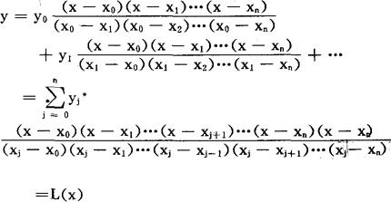 设有某函数y=f(x),其中有n+1个点,即x0,x1,x2,…xn的对应值y0,y1,y2,…yn为已知的,那么,就可以用下列次数不高于n+1的代数多项式y=L(x)作为原函数y=f(x)的近似方程: