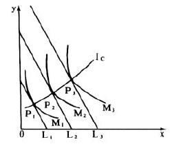 | 释义 | 收入-消费曲线 反映消费者在价格一定,收入不同时商品消费量变化的曲线,即收入变化后各均衡点的轨迹。如图,L1、L2、L分别为不同收入下的预算约束线,M1、M2、M为无差异曲线,P1、P2、P为L1M1、L2M2、LM的切点,则由P1、P2、P相连而成的曲线IC即为收入消费曲线,这一曲线显示了在不同收入情况下,消费者消费的两种商品数量的各种均衡组合。