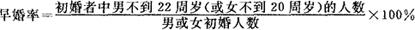 它是指一定时期内(如一年、半年)男性(女性)初婚者中未达到婚姻法规定的最低婚龄(男22周岁、女20周岁)者的比率,以百分数表示。计算公式是:
