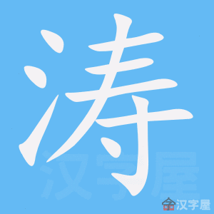 涛,甲骨文=(水,浪)+(寿 * ,长生不老),表示高而长的浪。造字本义:宽广水域上的冗长巨浪。篆文将甲骨文的“水”写成;将甲骨文的“寿”写成。隶书将篆文的写成;将篆文的“寿”写成。“涛”为名词,“滔”* 为动词。聚签为“筹”* ;广田为“畴”* ;大浪为“涛”;大帐为“帱”。