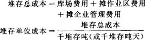指海河港口在港区内仓库、堆场(货场)、货棚的堆存保管工作中所发生的费用。堆存成本的构成,大部分为固定费用性质,一般只计算堆存工作的总成本,但也可以计算其工作量堆存吨或吨天的单位成本。其计算公式为: