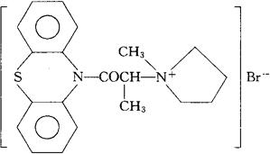 C20H23BrN2OS=419.38 CAS-145-54-0 1-甲基-1-(1-吩噻嗪-10-基羰基乙基)吡咯烷鎓溴化物. 1-Methyl-1-(1-phenothiazin-10-ylcarbonylethyl)pyrrolidinium bromide. 1-甲基-1-[1-甲基-2-氧代-2-(10H-吩噻嗪-10-基)乙基]吡咯鎓溴化物。 1-Methyl-1-[1-methyl-2-oxo-2-(10H-phenothiazin10-yl)ethyl]pyrrolidinium bromide. 解痉药,抗胆碱药,抗组胺药。 PropyromazineBromide,Diaspasmyl,LD335,SD 104-19. INN,USAN.