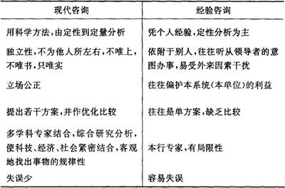 现代咨询一般指第二次世界大战以后的咨询活动,实质上是依靠具有丰富知识和经验的专家群体,有计划地针对某一特定的目标、运用智力劳动、提出解决方案的一种事业。现代咨询的主要特征为:1.咨询范围国际化,世界各地出现了上千家高级综合的咨询机构,跨国合作机构对全球性的问题进行研究与探索;2.咨询内容从工程建设扩大到决策咨询、管理咨询、专业咨询等许多方面,出现了咨询协会,行业系统正在形成;3.咨询业是知识与技术密集型产业,在社会经济结构中占有重要地位;4.重视信息资料的收集与利用。 现代咨询与经验咨询的主要区别如下表: