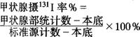 | 释义 | 甲状腺摄131碘试验 碘是甲状腺合成甲状腺激素的主要原料,所以131I能被甲状腺摄取和浓聚,被摄取量和用以合成甲状腺激素的速度在一定程度上与甲状腺功能有关。空腹口服131I后,利用131I能发射γ光子的特点,用甲动仪的γ闪烁探测器在颈前甲状腺部位测量服131I后2、4、6小时甲状腺摄131I率,即可得知甲状腺功能状态。