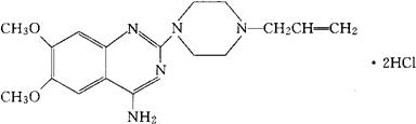 | 释义 | 盐酸喹唑嗪 C17H23N5O2·2HCl=402.32 CAS-7262-00-2 2-(4-烯丙基-1-哌嗪基)-4-氨基-6,7-二甲氧喹唑啉二盐酸盐。 2-(4-Allyl-1-piperazinyl)-4-amino-6,7-dimethoxy quinazoline dihydrochloride. 抗高血压药。 Quinazosin Hydrochloride.CP 11332-1. USAN.