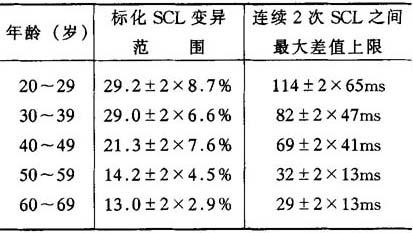| 释义 | 窦性周期长度 记录1min体表心电图后,作如下计算,标化SCL变异范围=(最长SCL-最短SCL)/平均SCL,连续2次SCL之间最大差值上限(max△SCL),参数都以均值±2X标准差表示。正常值见表: 窦性周期长度(SCL)