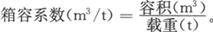 集装箱内容积(m3)与载重(t)之比。集装箱的容积性能指标,可判定装载重货或轻泡货的适应程度。其计算公式为: