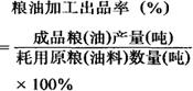 | 释义 | 粮油加工出品率 生产成品粮、植物油的数量对其耗用原粮、油料数量的百分比。它是考核粮油加工厂增产节约情况的重要经济技术指标之一,如稻谷出米率、小麦出粉率、花生仁出油率、油菜籽出油率、棉籽出油率、大豆出油率、芝麻出油率、米糠出油率、葵花籽出油率等。其计算公式为: