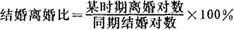 一定时期内(通常为一年)离婚对数与结婚对数之比,以百分数表示。计算公式是: