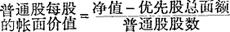 指证券分析家所使用的一个会计概念,一般用于计算普通股的帐面价值。计算普通股的帐面价值,只要将一个公司的净值减去流通外的优先股的总面额,再除以流通在外的普通股数。其公式表示如下: