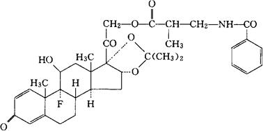C35H42FNO8=623.72 CAS-31002-79-6 9-氟-11β,16α-17,21-四羟孕甾-1,4-二烯-3,20-二酮与丙酮复合成环16,17-乙缩醛与N-苯甲酰-2-甲基-β-丙氨酸生成21-酯。 9-Fluoro-11β,16α-17,21-tetrahydroxypregna-1,4-diene-3,20-dione cyclic 16,17-acetal with acetone21-ester with N-benzoyl-2-methyl-β-alanine. 肾上腺皮质激素类药,消炎药。 Triamcinolone Benetonide,Alcorten,Benecorten. INN,USAN,MI.
