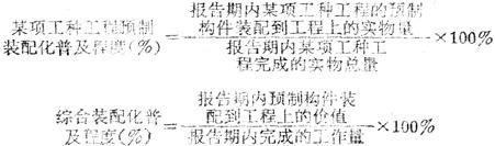 | 释义 | 装配化普及程度指标 指建筑物所需的各种物件如梁、板、柱、屋架、砌体等由固定的或临时加工厂生产,或在现场制作,然后采用装配式施工方法进行施工的程度。它可分成某项工种工程预制装配化普及程度和综合装配化普及程度两个指标。计算公式为: