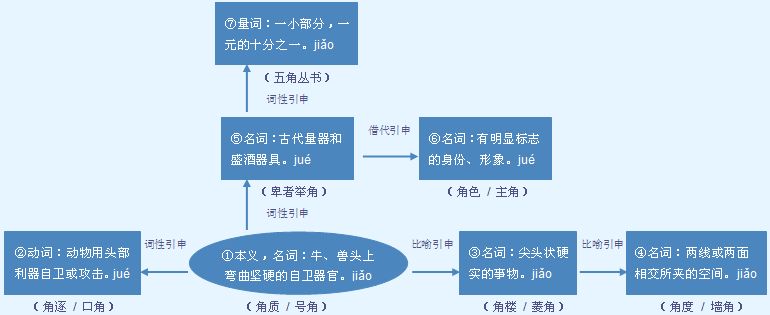 字源解说 角,甲骨文 、 像牛或其他大型动物头上弯曲、尖硬、带纹路的自卫器官,古人将其用作量器和乐器。造字本义:牛、兽头上弯曲坚硬的自卫器官,亦用作量器和乐器。金文 、 在顶端加 、 ,表示挂扣。篆文 误将金文 的挂扣状 写成了“人” 。 附 文言版《説文解字》:角,獸角也。象形,角與刀、魚相似。凡角之屬皆从角。 附 白话版《说文解字》:角,兽角。象形,角与刀、鱼相似。所有与角相关的字,都采用“角”作边旁。 引申线索